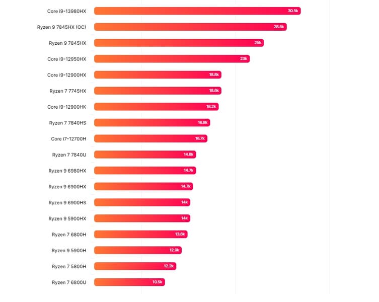 Кроме того, это очень близко к результату флагманского Core i9-13980HX, а ведь в линейке AMD есть ещё 16-ядерный Ryzen 9 7945HX, и его тоже можно разогнать.