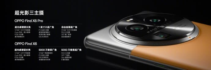 Oppo Find X6 построен на SoC Dimensity 9200. Он получил экран OLED с диагональю 6,74 дюйма, разрешением 2772 х 1240 пикселей и яркостью до 1450 кд/кв.м, камеру Hasselblad с 50-мегапкисельными сенсорами Sony IMX890 и Samsung JN1, аккумулятор ёмкостью 4800 мА·ч с поддержкой зарядки мощностью 80 Вт.