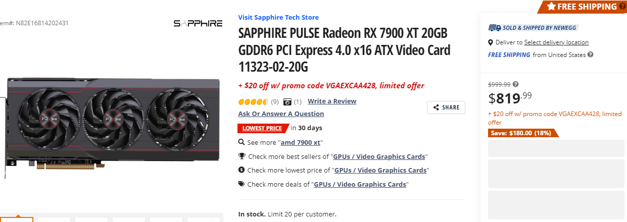 Карта сейчас доступна на NewEgg за 820 долларов, но есть возможность использования промокода для получения дополнительной скидки в 20 долларов. Таким образом, сейчас это самое доступное решение среди всех RX 7900 XT. Кроме того, как показывает обзор TechPowerUp, это ещё и одна из самых тихих версий RX 7900 XT, хотя при этом далеко не самая холодная.
