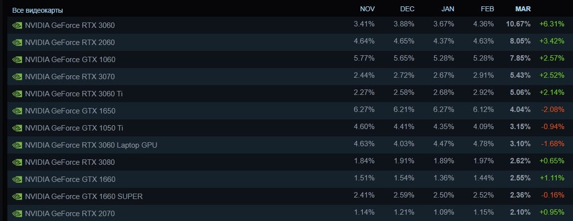 На втором месте, к слову, оказалась RTX 2060, которая за месяц также очень хорошо прибавила: на 3,42 процентного пункта, до 8,05%. Замыкает тройку лидеров GTX 1060, которая, что интересно, тоже хорошо подросла: с 5,28% до 7,85%. А вот доля GTX 1650, которая долгое время удерживала лидерство, упала сразу на 2,08 п.п., до 4,04%.