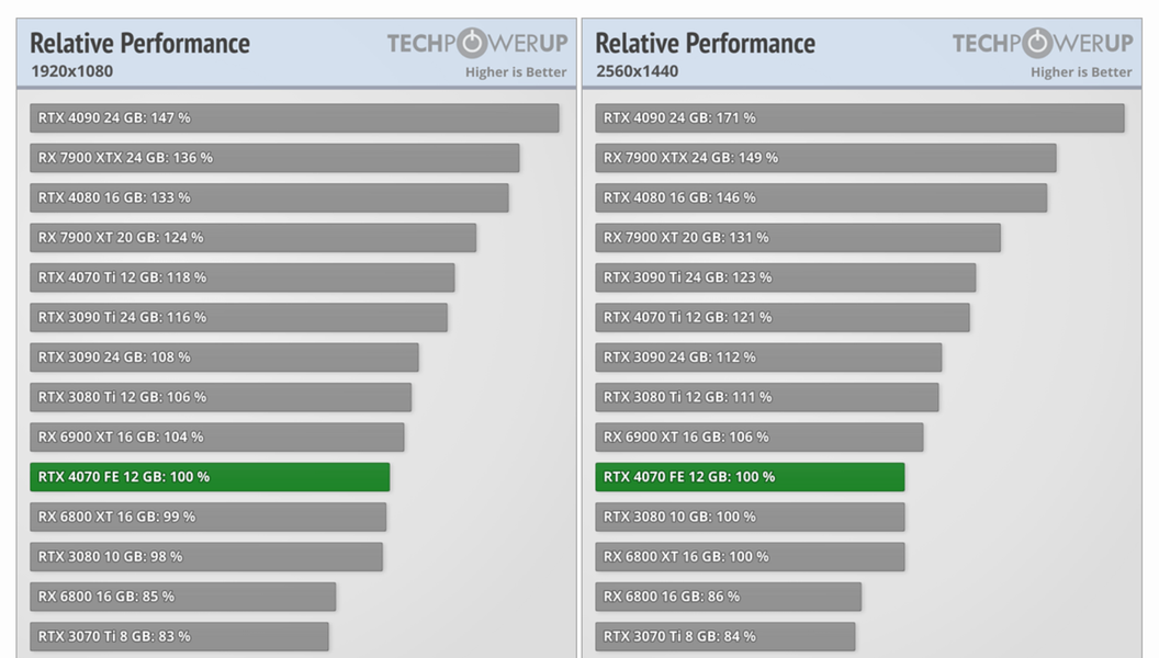 Несмотря на то, что Radeon RX 6950 XT не нова, эта видеокарта по-прежнему хорошо подходит для игр. Более того, в игровых тестах Techpowerup Radeon RX 6900 XT обходит GeForce RTX 4070 на 4-6% (причем чем больше разрешение, тем больше отрыв видеокарты AMD), следовательно производительность Radeon RX 6950 XT должна быть примерно на 10% выше, чем у GeForce RTX 4070.