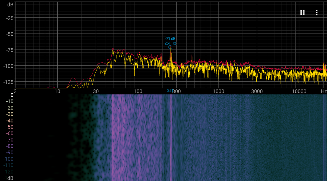 Уровень шума этой системы охлаждения меняется в широком диапазоне. Зависит, конечно, от индивидуальных особенностей и других факторов, но где-то от 40 дБА и выше шум, с нашей точки зрения, очень высокий для настольной системы; от 35 до 40 дБА уровень шума относится к разряду терпимых; ниже 35 дБА шум от системы охлаждения не будет сильно выделяться на фоне типичных небесшумных компонентов ПК — корпусных вентиляторов, вентиляторов на блоке питания и на видеокарте, а также жестких дисков; а где-то ниже 25 дБА кулер можно назвать условно бесшумным. Фоновый уровень был равен 16,0 дБА (условное значение, которое показывает шумомер). В районе 1300 об/мин (КЗ = 45%) может появляться резонансное гудение вентиляторов, но при изменении КЗ в большую или меньшую сторону гудение исчезает, да и громкость его невелика. На спектрограмме ниже пик на 250 Гц как раз соответствует этому гудению.