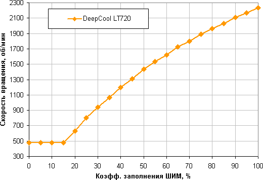 Хороший результат — монотонный рост скорости вращения при изменении коэффициента заполнения от 15% до 100%, диапазон регулировки скорости вращения широкий. При снижении коэффициента заполнения (КЗ) до 0% вентиляторы не останавливаются. Это может иметь значение, если пользователь хочет создать гибридную систему охлаждения, которая при низкой нагрузке работает полностью или частично в пассивном режиме.