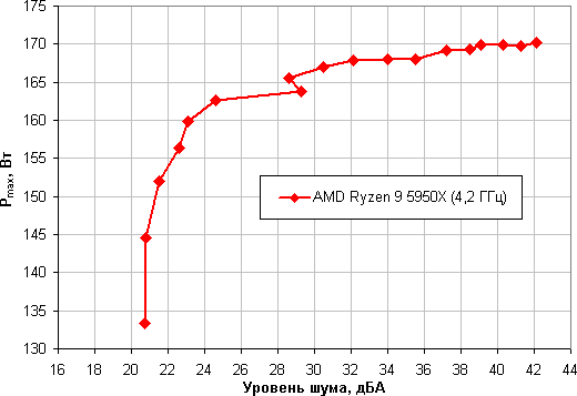 Приняв 25 дБА за критерий условной бесшумности, получим, что максимальная мощность процессора, соответствующая этому уровню, составляет порядка 162 Вт. Если не обращать внимания на уровень шума, то предел мощности можно увеличить где-то до 170 Вт. Еще раз уточним: это в жестких условиях обдува радиатора нагретым до 44 градусов воздухом. При снижении температуры воздуха указанные пределы мощности для бесшумной работы и максимальной мощности возрастают. Поэтому при условии достаточно хорошей вентиляции в корпусе данный кулер справится с охлаждением процессора AMD Ryzen 9 5950X.