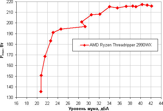 Ограничившись указанными выше условиями (но максимальную температуру примем за 68 °C), построим зависимость реальной максимальной мощности (обозначенной как Pmax), потребляемой процессором, от уровня шума уже в случае AMD Ryzen Threadripper 2990WX: