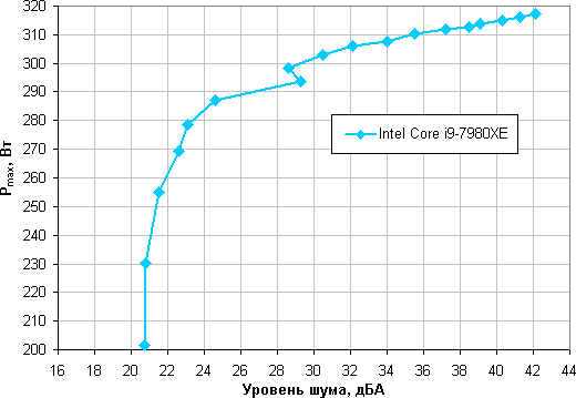 Приняв 25 дБА за критерий условной бесшумности, получим примерную максимальную мощность процессоров, соответствующих этому уровню. Это порядка 285 Вт для процессора Intel Core i9-7980XE. Если не обращать внимания на уровень шума, то пределы мощности можно увеличить где-то до 315 Вт. Еще раз уточним, это в жестких условиях обдува радиатора нагретым до 44 градусов воздухом, при снижении температуры воздуха указанные пределы мощности для бесшумной работы и максимальной мощности возрастают. Фактически эта СЖО справится с охлаждением данного процессора во всех реалистичных сценариях использования.