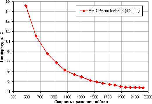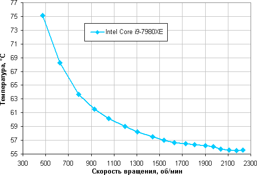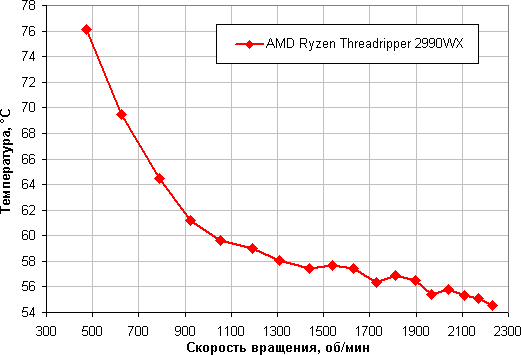 Зависимость температуры процессора AMD Ryzen Threadripper 2990WX при его полной загрузке от скорости вращения вентиляторов: