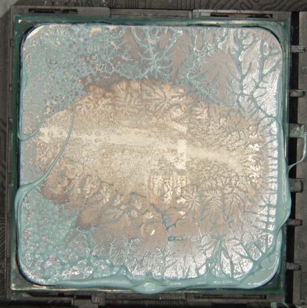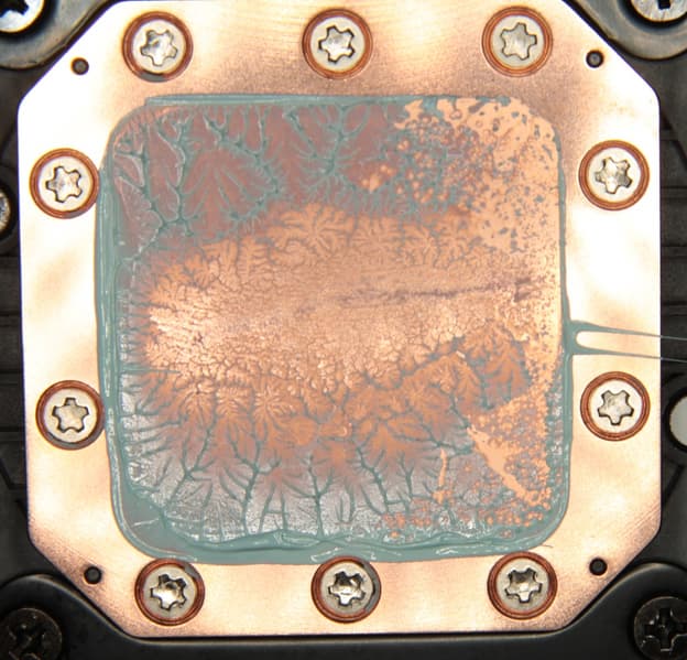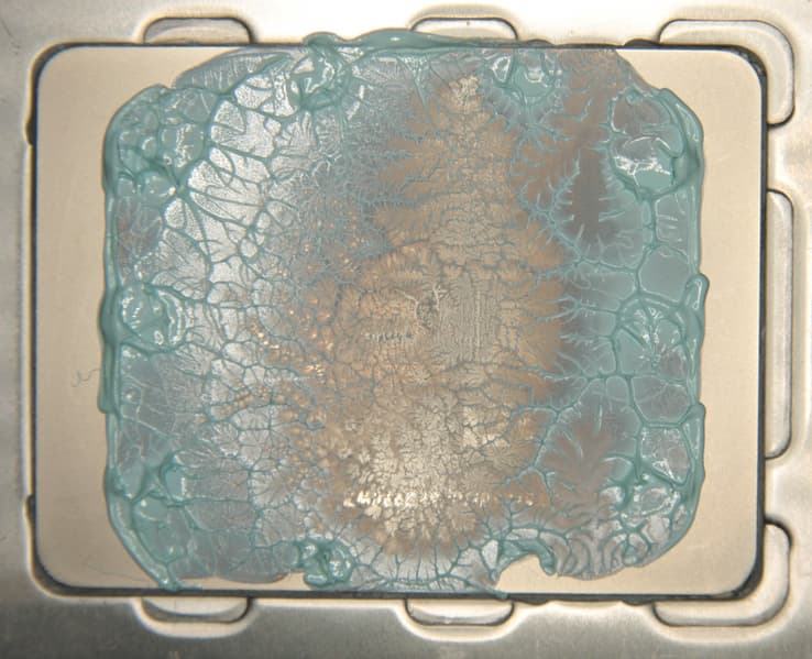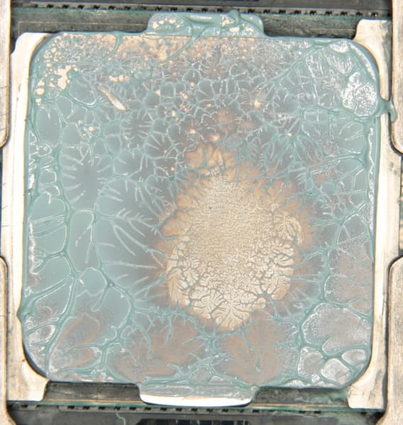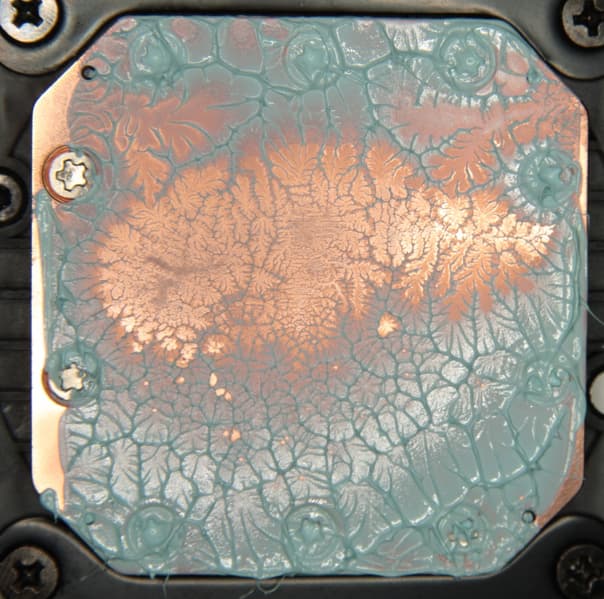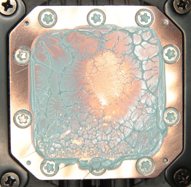 Видно, что термопаста распределилась тонким слоем на всю площади крышки процессора, а ее избытки выдавились за края. Участок плотного контакта расположен примерно по центру и имеет большую площадь. Отметим, что крышка этого процессора сама по себе чуть выпуклая к центру. (Распределение термопасты, конечно, немного изменилось при разъединении процессора и помпы.)