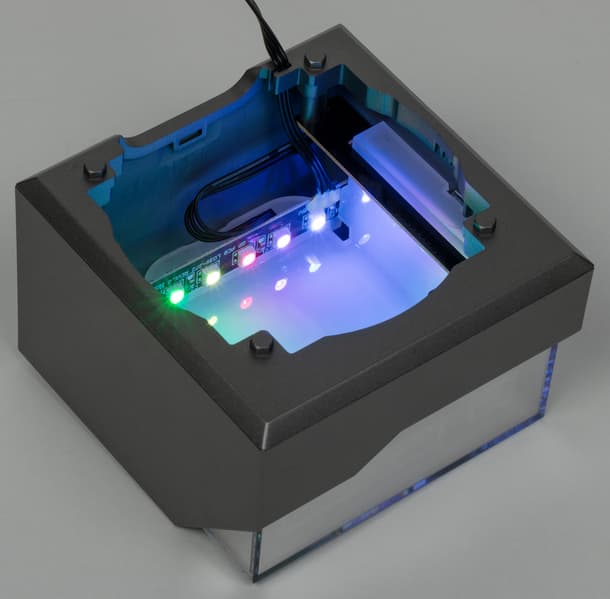 Под этой вставкой расположен светорассеиватель из белого полупрозрачного пластика с рисунком. Светорассеиватель подсвечивается 16 адресуемыми RGB-светодиодами, управляемыми извне по трехпроводному интерфейсу. Свет от них отражается между светорассеивателем и вставкой, что создает трехмерный эффект. Дополнительно отдельным светодиодом подсвечивается логотип производителя.