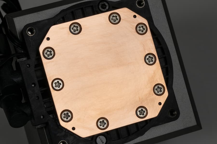 Система герметичная, заправлена, готова к использованию. Помпа интегрирована в один блок с теплосъемником. Подошвой теплосъемника, непосредственно прилегающей к крышке процессора, служит медная пластина. Ее внешняя поверхность ровная, шлифованная и слегка полированная. К центру она выпуклая с перепадом порядка 0,2 мм.