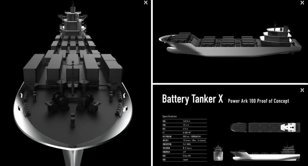 Японский стартап PowerX разработал концепцию аккумуляторного танкера под названием «X», предназначенного для транспортировки электроэнергии морем. По мнению создателей, такое судно поможет переправить электроэнергию из регионов, где она будет вырабатываться, туда, где в ней больше всего нуждаются. Ведь одни регионы в изобилии располагают источниками возобновляемой энергии, а другие находятся в невыгодном географическом положении, и им необходимо откуда-то получать энергию. «X» особенно пригодится там, где невозможна прокладка кабелей из-за высокой сейсмической активности или большой глубины.