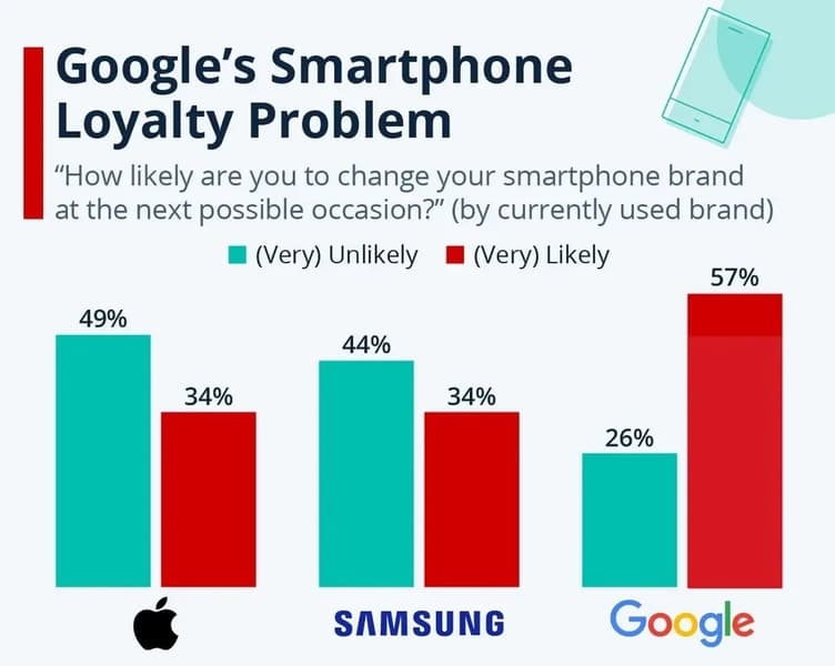 Компания Statista, специализирующаяся на рыночных исследованиях, провела опрос среди пользователей смартфонов и выявила интересную тенденцию. Оказывается, почти 60% пользователей Pixel готовы перейти на смартфон другого бренда, и только около 26% заявили, что готовы сохранить лояльность бренду Pixel. Для сравнения: на графике ниже представлены мнения пользователей смартфонов Apple и Samsung — и те гораздо лояльнее к брендам iPhone и Galaxy соответственно.