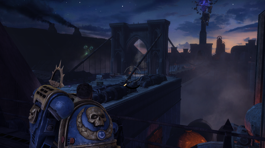 Игра вышла в 2011 году и это явно видно по картинке. Периодически замечал за собой попытки протереть монитор от мыла. Лесенки и несостыковки моделек периодически притягивали на себя взгляд в кат сценах. Атмосфера в общем и целом: прикольная мешанина. Вот тебе Орки из WarCraft, вот тебе Космодесант из StarCraft с пластмассовой бронёй, вот тебе эпичные и помпезные декорации в готическом стиле, везде понатыкаем черепа: на дверях черепок, летающий черепок, на вражеских турелях черепок, на броне +100500 черепков, а вот тебе свиток на стене, зачем? просто чтобы был.