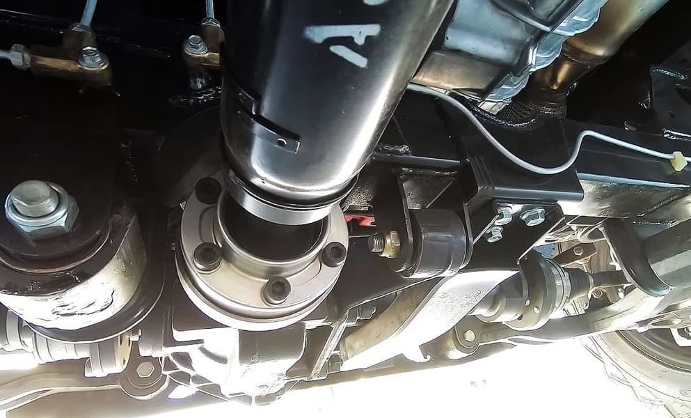 Также на фото видно новую раздаточную коробку в алюминиевом корпусе (она должна выдерживать крутящий момент до 400 Н·м), усиленный подрамник и короткий карданный вал на переднюю ось со ШРУСами вместо крестовины.