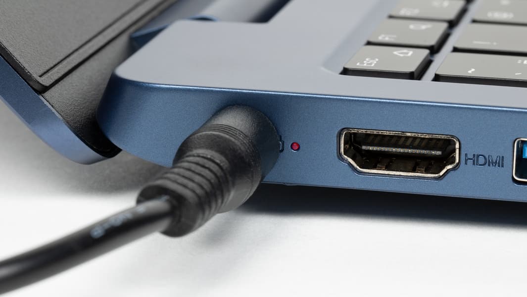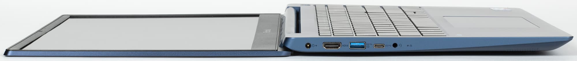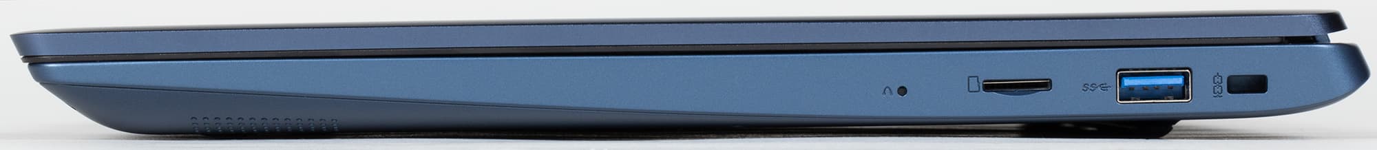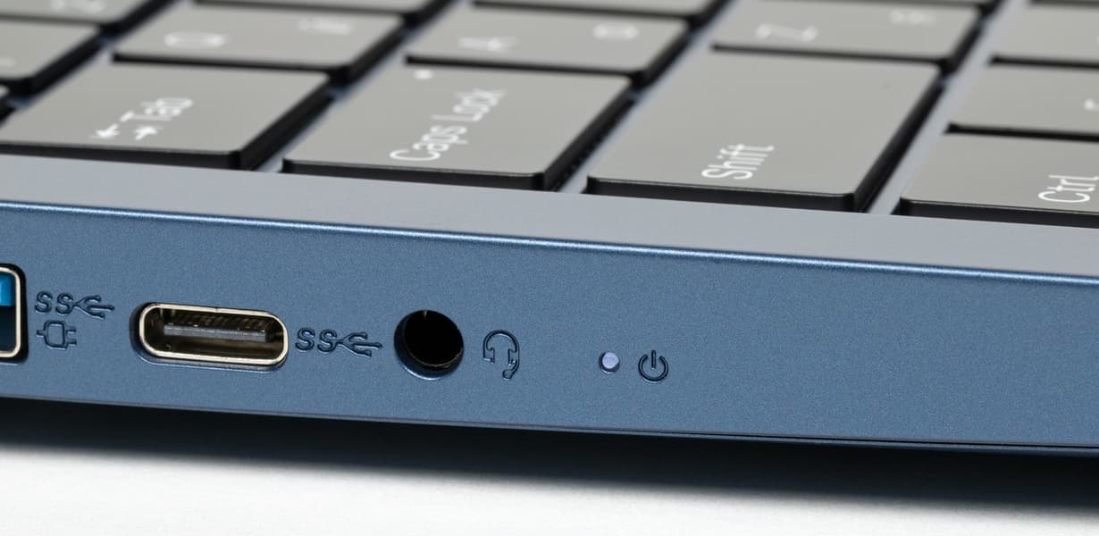 Слева находятся гнездо питания с индикатором заряда, полноразмерный порт HDMI, второй USB3 Gen1 Type-A и единственный USB3 Gen2 Type-C (он поддерживает только передачу данных), комбинированный миниджек для аудиогарнитуры и белый индикатор включения.