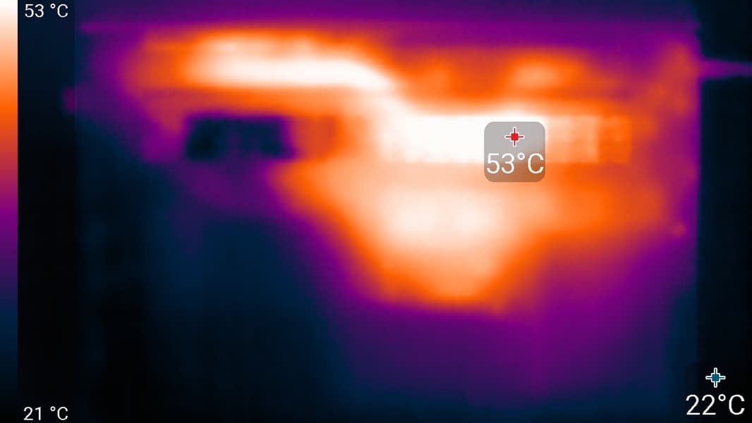 На заднем торце корпуса идет ряд более крупных отверстий, через которые система вентиляции выбрасывает нагретый воздух; на приведенном ниже фото они скрыты выступом петли. Как часто бывает в подобных конструкциях, получается подогрев нижней области экрана — в основном правее середины, где расположен вентилятор системы охлаждения. Во время запуска «тяжелых» тестов выяснилось: нагрев вполне ощутимый, но всё же не критический.
