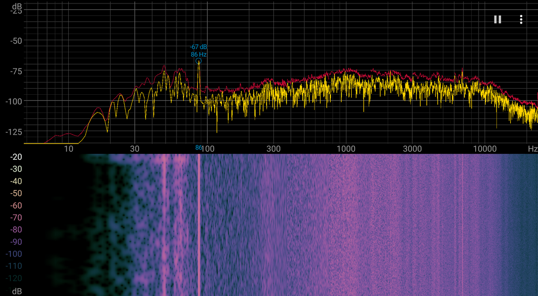 Под большой нагрузкой шум от системы охлаждения довольно высокий. Однако характер шума ровный и раздражения не вызывает. Спектрограмма, полученная для варианта с максимальной нагрузкой на процессор, достаточно ровная, и в диапазоне частот, где звуки могут вызывать особенное раздражение, выраженных пиков нет (низкочастотными пиками можно пренебречь):