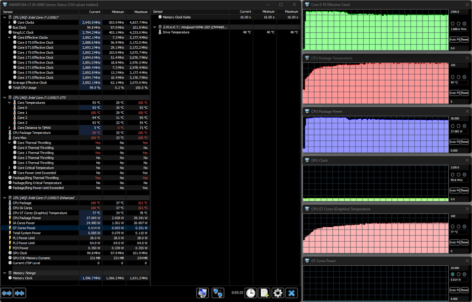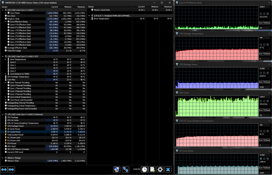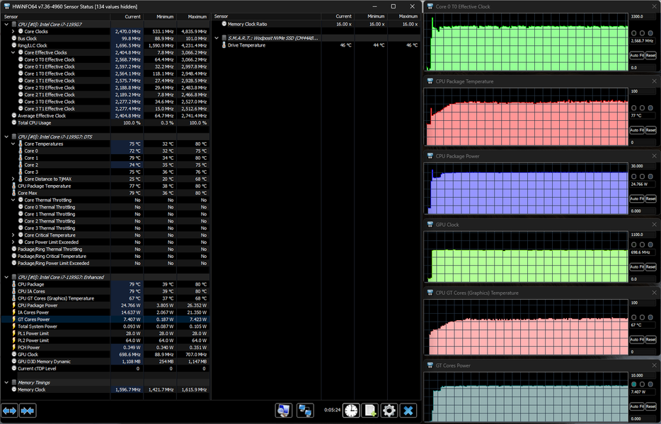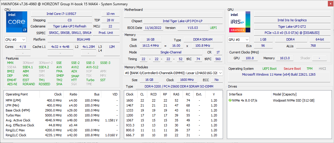В ноутбуке установлен не самый свежий, но и не древний процессор Intel Core i7-1195G7 (10 нм SuperFin, кодовое наименование Tiger Lake, выпускается с середины 2021 года), который предназначен для ультрабуков. У него 4 ядра, которые могут работать на частотах от 1,3 до 5,0 ГГц, при нагрузке на все ядра максимальная частота составит 4,6 ГГц (по другим данным — 4,8 ГГц).