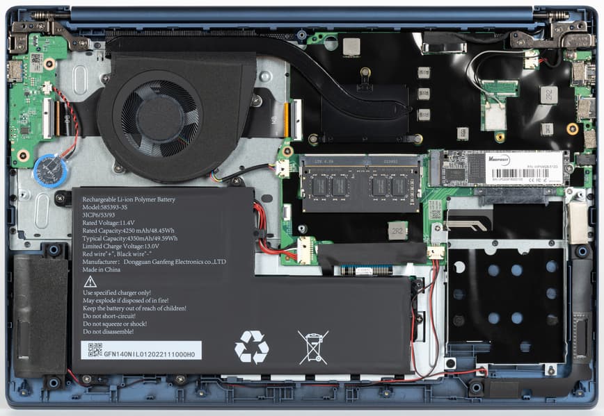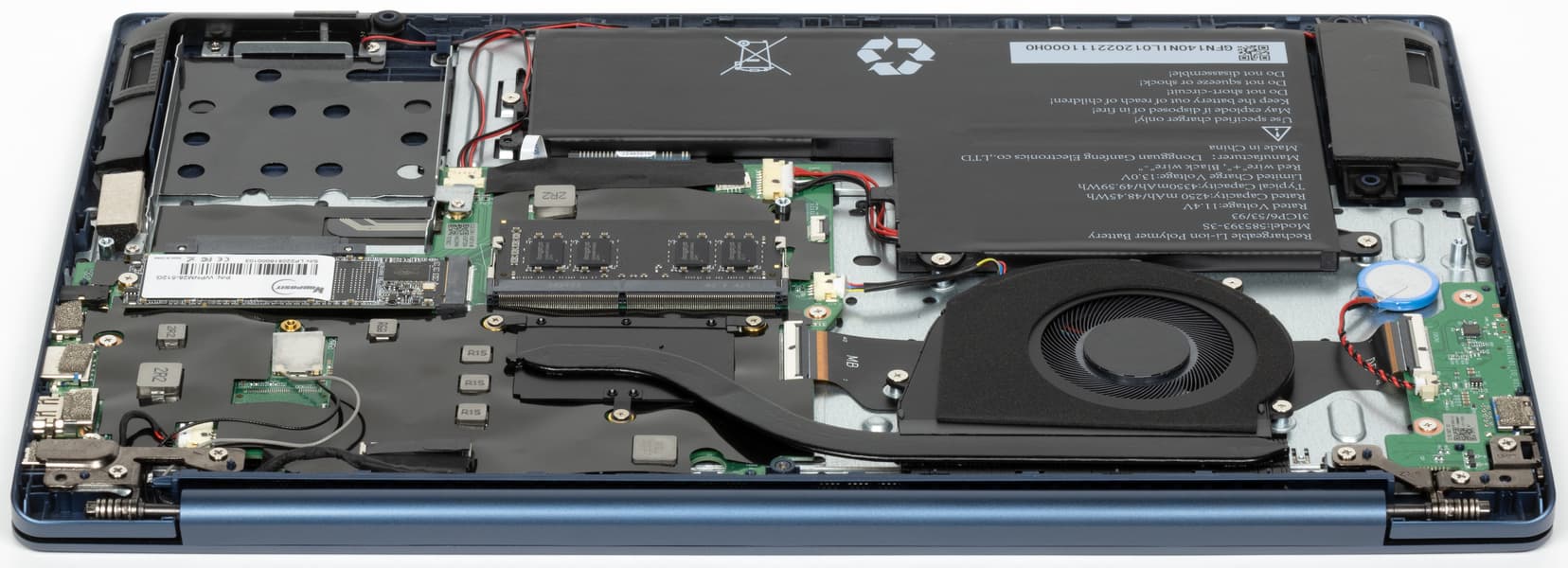 Процессор не новейший, но и не «музейный», к тому же его TDP производителем ноутбука не ограничен, что часто делают для оптимизации теплового режима. Однако система охлаждения, хоть и довольно шумная, не отличается особой эффективностью: при существенных нагрузках она не в силах исключить перегрев. Объема оперативной памяти и емкости накопителя для большинства задач достаточно, но оба эта компонента можно дополнительно проапгрейдить: объем ОЗУ увеличивается только заменой имеющегося модуля (который работает в одноканальном режиме), а для второго SSD предусмотрен только интерфейс SATA, не NVMe. Показанные в тестах приложений результаты можно назвать лишь средними, а про современные игры говорить тем более нет смысла — подобные ноутбуки к игровым и близко не относятся.
