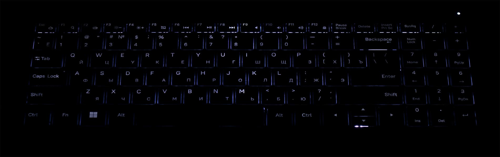 Предусмотрена подсветка — белая, с одним уровнем, не слишком яркая. При неиспользовании клавиатуры в течение 15 секунд она автоматически отключится и вновь включится после нажатия любой клавиши (тачпад не в счет). Ее можно отключить совсем сочетанием кнопок.