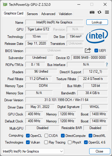 | Видеоподсистема | интегрированная Intel Iris Xe | |