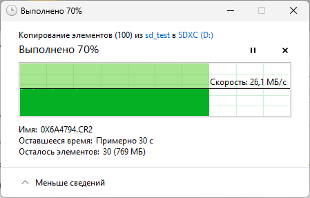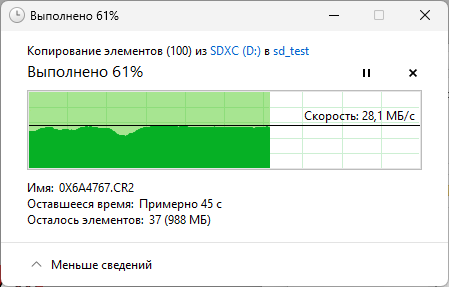 Второй тест — скорость реальных файловых операций, выполняемых средствами ОС: копирование 100 файлов изображений общим объемом 2,5 ГБ сначала с носителя в папку на рабочем столе, затем из папки на носитель.