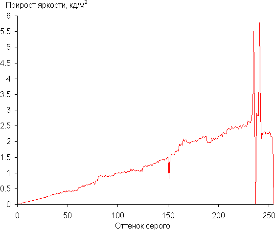 Далее мы измерили яркость 256 оттенков серого (от 0, 0, 0 до 255, 255, 255). График ниже показывает прирост (не абсолютное значение!) яркости между соседними полутонами: