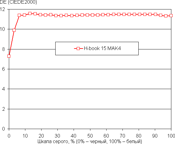 Рост прироста яркости на большей части шкалы серого более-менее равномерный, но в светах монотонность роста нарушается и пара пар оттенков по яркости друг от друга не отличаются. В самой темной области аппаратно и визуально различаются все оттенки: