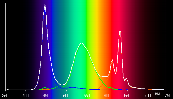 Поэтому визуально цвета изображений, ориентированных на вывод в пространстве sRGB, на этом экране имеют естественную насыщенность. Ниже приведен спектр для белого поля (белая линия), наложенный на спектры красного, зеленого и синего полей (линии соответствующих цветов):