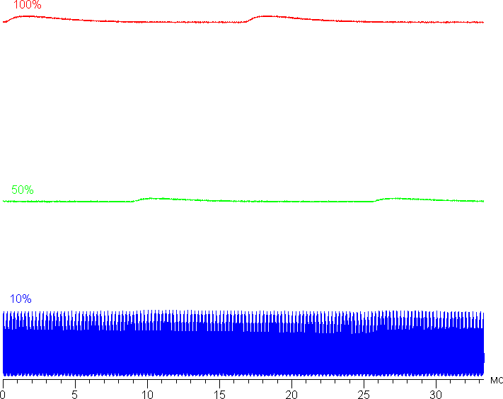 При сильном снижении яркости от максимальной появляется модуляция подсветки, но ее частота очень высокая (24 кГц), поэтому никакого видимого глазом мерцания экрана нет, не выявляется оно и в тесте на стробоскопический эффект. Приведем графики зависимости яркости (вертикальная ось) от времени (горизонтальная ось) при различных значениях настройки яркости: