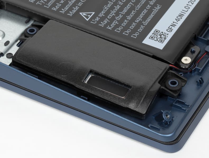 На правом боку имеются отверстие кенсингтонского замка, порт USB3 Gen1 Type-A, а также прорезь картовода microSD. Еще есть небольшое отверстие, явно рассчитанное на какую-то кнопку с нажатием тонким подручным предметом (если судить по символу изогнутой дугой стрелки, подразумевался вход в OneKey Recovery), но сама кнопка внутри отсутствует — это видно на приведенной далее фотографии со снятой нижней крышкой, да и в инструкции подобное не упоминается.