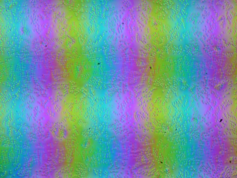 Зерно этих дефектов в несколько раз меньше размеров субпикселей (масштаб этих двух фотографий примерно одинаковый), поэтому фокусировка на микродефектах и «перескок» фокуса по субпикселям при изменении угла зрения выражены слабо, из-за этого нет и «кристаллического» эффекта.