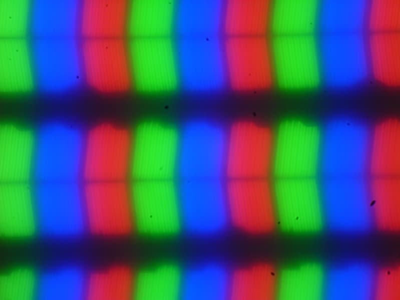 В этом ноутбуке используется матрица типа IPS. Микрофотографии демонстрируют типичную для IPS структуру субпикселей (черные точки — это пыль на матрице фотоаппарата):