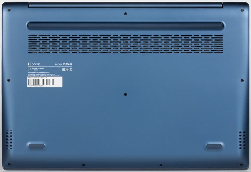 На днище, кроме ножек (сзади одна, которая протянулась почти по всей ширине, спереди две небольших), ближе к задней кромке имеется область со множеством вентиляционных прорезей, через них происходит забор воздуха для охлаждения компонентов, поэтому ставить ноутбук на мягкую поверхность не следует.
