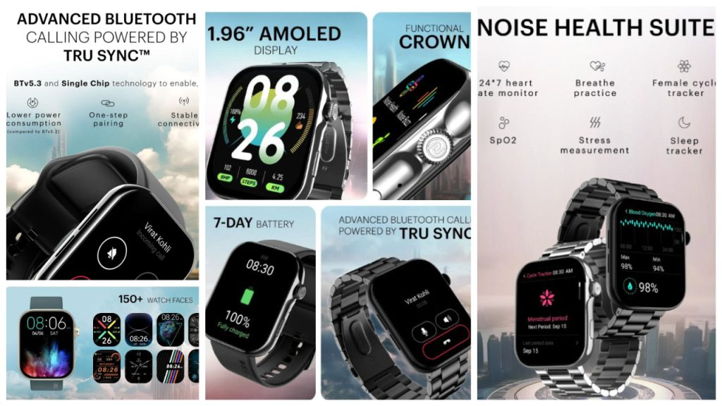 Noise ColorFit Vision 3 оснащаются 1,96-дюймовым экраном AMOLED разрешением 410 x 502 пикселя. Поддерживаются более 150 циферблатов и 100 спортивных режимов, Bluetooth 5.3 и звонки по Bluetooth, круглосуточное отслеживание пульса, содержания кислорода в крови (SpO2), качества сна и уровня стресса. Предусмотрена защита от воды и пыли (IP68). Аккумулятор ёмкостью 300 мА·ч обеспечивает до 7 дней автономной работы.