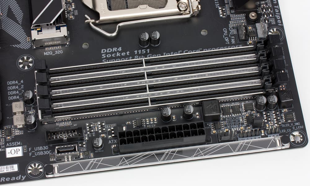 Для установки модулей памяти на плате Z370 Aorus Ultra Gaming 2.0-OP предусмотрено четыре DIMM-слота. Плата поддерживает небуферизованную память DDR4 (non-EСС), а максимальный объем памяти составляет 64 ГБ (при использовании модулей емкостью по 16 ГБ).