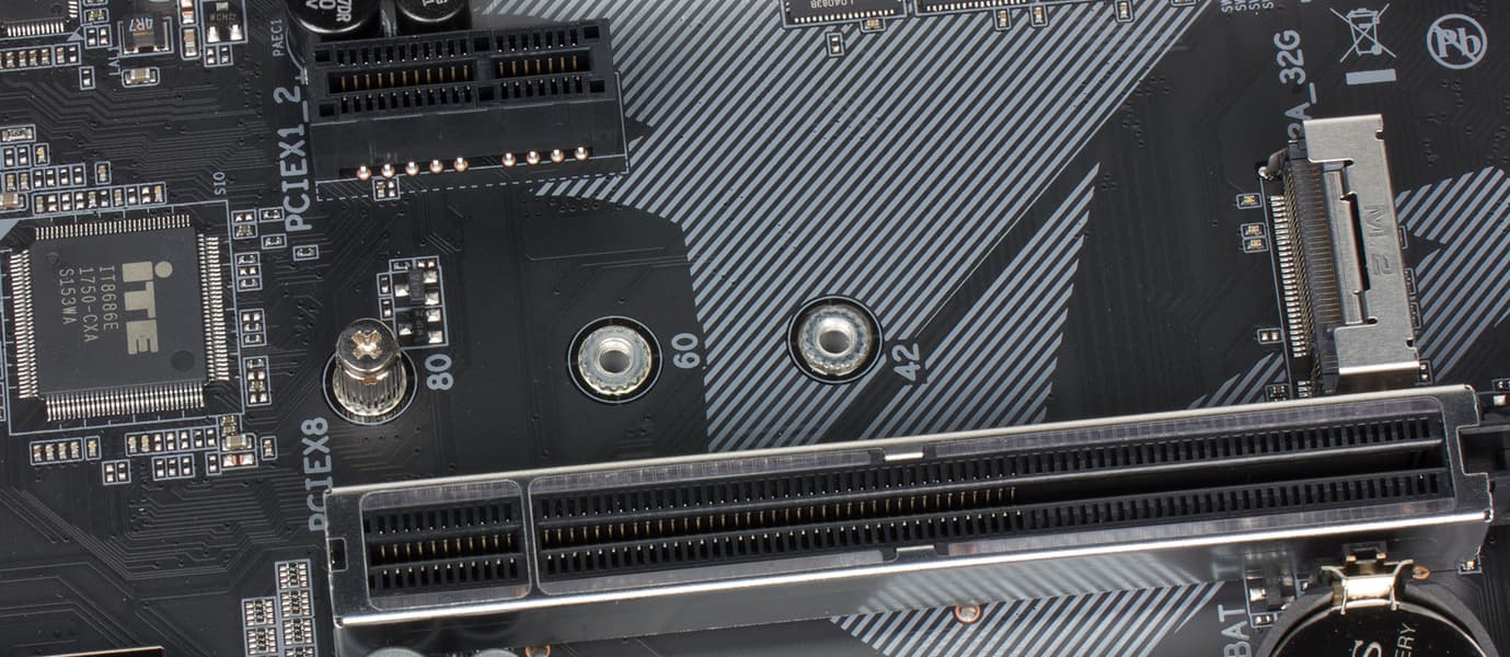 Разъемы M.2 предназначены для установки SSD-накопителей. Один разъем (M2Q_32G), ближайший к разъему процессора, поддерживает только устройства PCIe 3.0 x4/x2 и позволяет устанавливать накопители типоразмера 2242/2260/2280/22110. Для накопителей, устанавливаемых в данный разъем, предусмотрен радиатор.