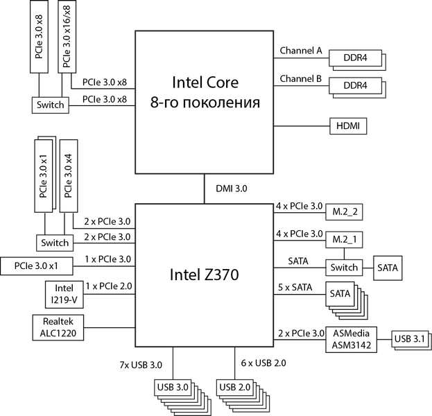 Напомним, что чипсет Intel Z370 имеет 30 высокоскоростных портов ввода/вывода (HSIO), в качестве которых могут быть порты PCIe 3.0, USB 3.0 и SATA 6 Гбит/с. Часть портов строго фиксированы, но есть HSIO-порты, которые могут конфигурироваться как USB 3.0 или PCIe 3.0, SATA или PCIe 3.0. Причем всего может быть не более 10 портов USB 3.0, не более 6 портов SATA и не более 24 портов PCIe 3.0.