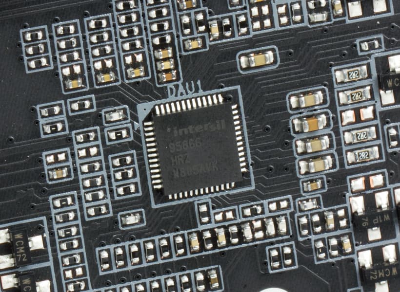 Управляется регулятор напряжения питания 7-фазным (4+3) PWM-контроллером Intersil ISL95866. В каждом канале питания используется пара MOSFET-транзисторов NTMFS4C06N и NTMFS4C10N компании On Semiconductor.