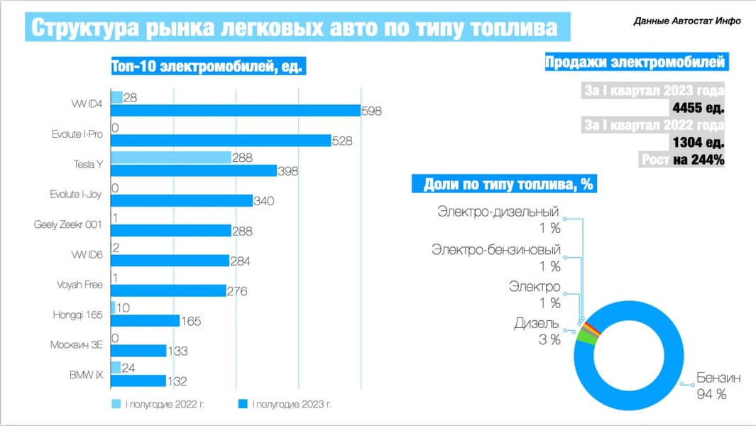 В структуре продаж первое место у Volkswagen ID. 4 – за 2023 год продано 598 единиц против всего лишь 28 единиц, реализованных в прошлом году. На втором месте российский Evolute i-Pro (528 проданных авто), на третьем месте – Tesla Model Y (398 единиц продано в текущем году).
