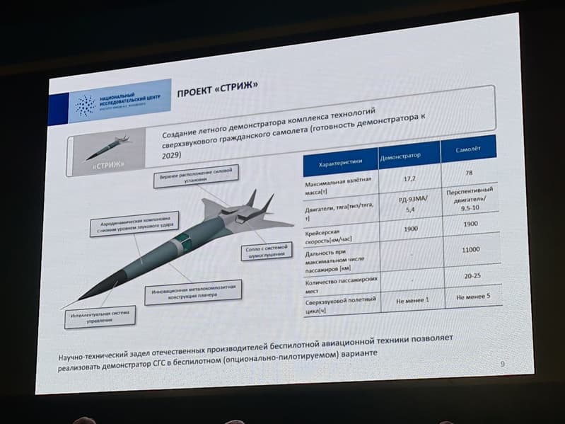 Пассажировместимость самолёта составит 20-25 человек. С максимальным количеством пассажиров он сможет пролететь до 11 тыс. км при крейсерской скорости 1900 км/ч. Судя по всему, демонстратор «Стрижа» будет беспилотным.