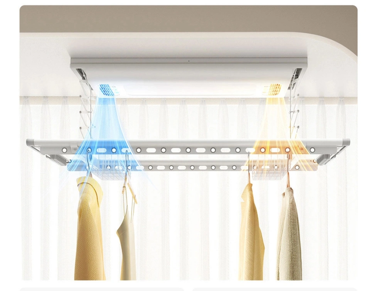 Умная сушилка для белья Xiaomi Mijia Smart Clothing Dryer 1S получила 38 независимых воздуховыпускных отверстий, две многофункциональные сушильные корзины, 4 выдвижных сушильных стержня. Толщина выдвижной платформы составляет всего 9,9 см, при этом сушилка выдерживает нагрузку до 35 кг. В неиспользуемом состоянии её можно поднять под самый потолок, освободив проход к окну, если сушилка размещена, как показано на фото.