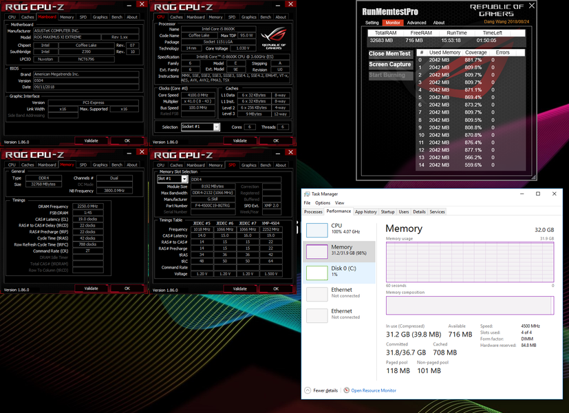Модули DDR4-4500 из набора суммарным объемом 32 ГБ работали в системе, построенной на плате ASUS ROG MAXIMUS XI Extreme.