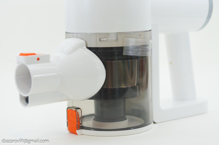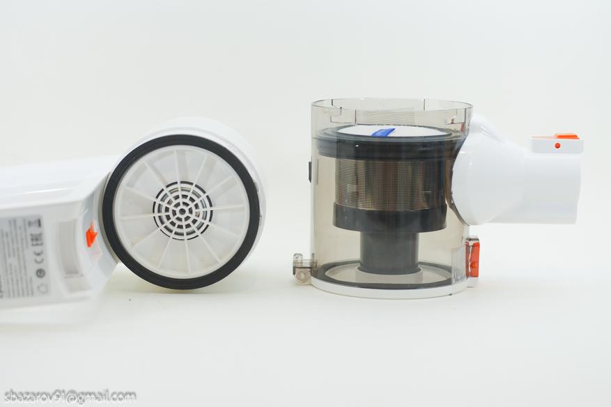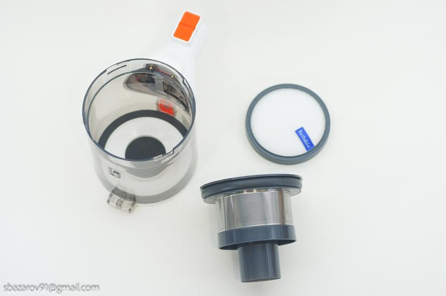 В ходе тестов хочу отметить правильную работу циклонного фильтра, при котором весь мусор вращается по кругу в нижней части и не оседает на сеточку. Таким образом можно долгое время не очищать резервуар и не терять производительность.