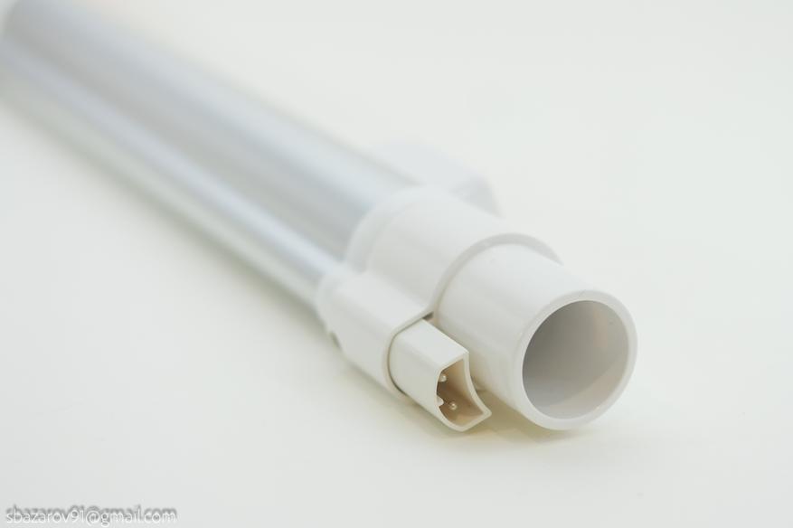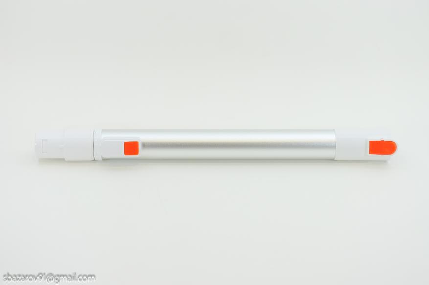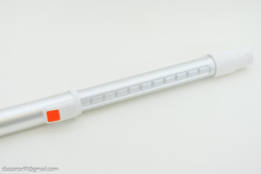 Далее идет телескопическая трубка, которая позволяет не только изменять длину, но и передаёт силовой контакт для работы и подсветки напольной щетки. Максимальная длина трубы — 65см, минимальная — 42.5см.