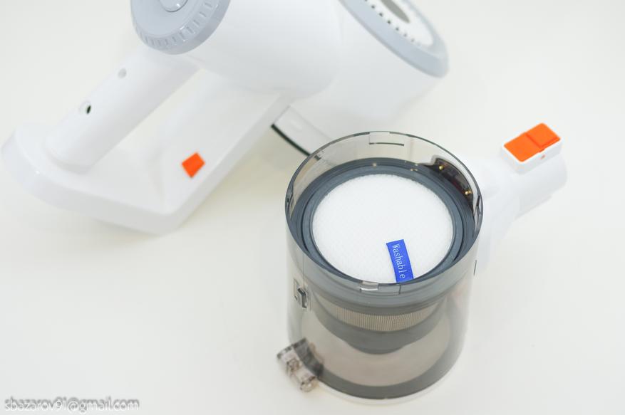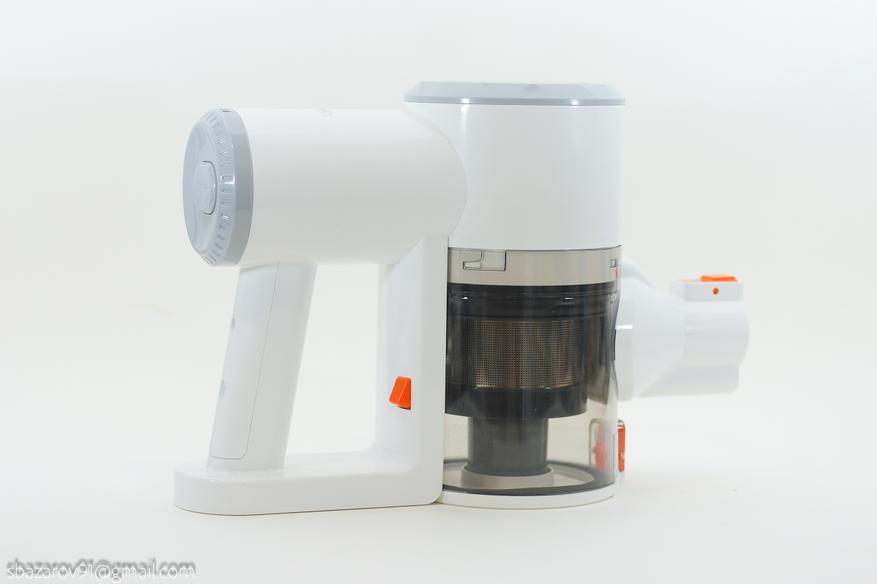 Ниже электромотора находится резервуар с циклонным фильтром. Полезный объем — 800мл. Система фильтрации стандартная: моющий элемент перед электромотором и съемный циклон. Для опустошения резервуара от мусора достаточно нажать на фиксатор дверцы и открыть её, тут без изменений.