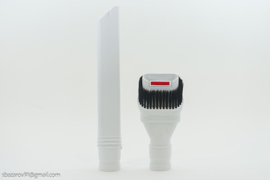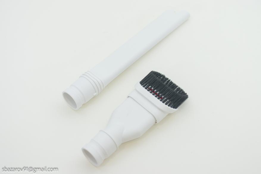 Помимо напольной щетки в комплекте предусмотрены узкая щетка для доступа к труднодоступным местам, и щетка для очистки мебели. Оба аксессуара выполнены из мягкого матового пластика и имеют качественное исполнение.