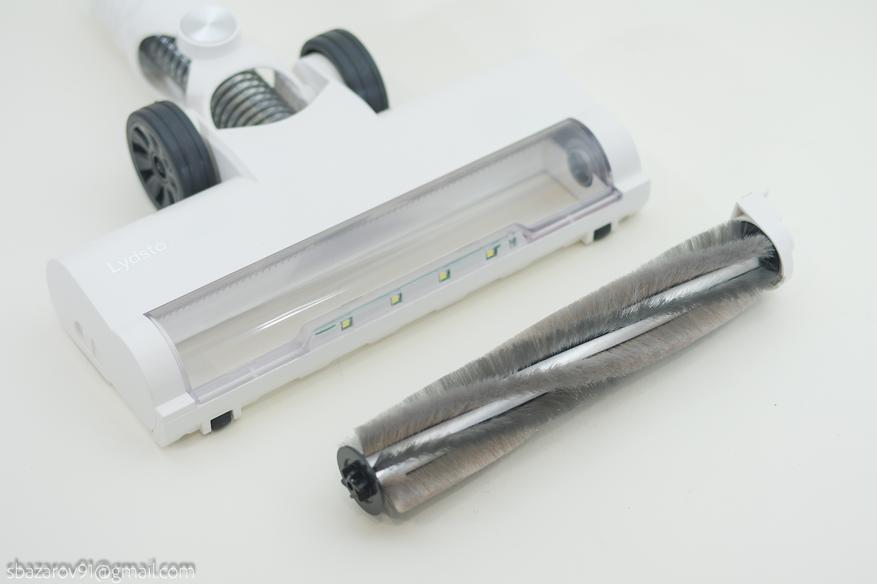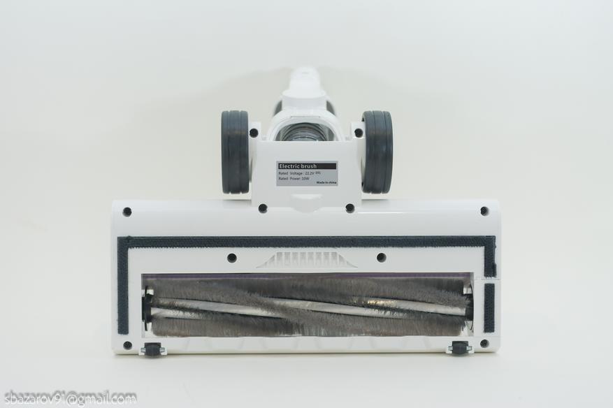 Напольная щетка получила моторизированный привод (с применением ремня), щетку из мягкого ворса и светодиодную подсветку в передней части корпуса. Последний аспект реализован с помощью 4-х светодиодов и позволяет дополнительно подсвечивать мусор. Для больше мобильности щетка оснащена шарниром для наклона в двух плоскостях.