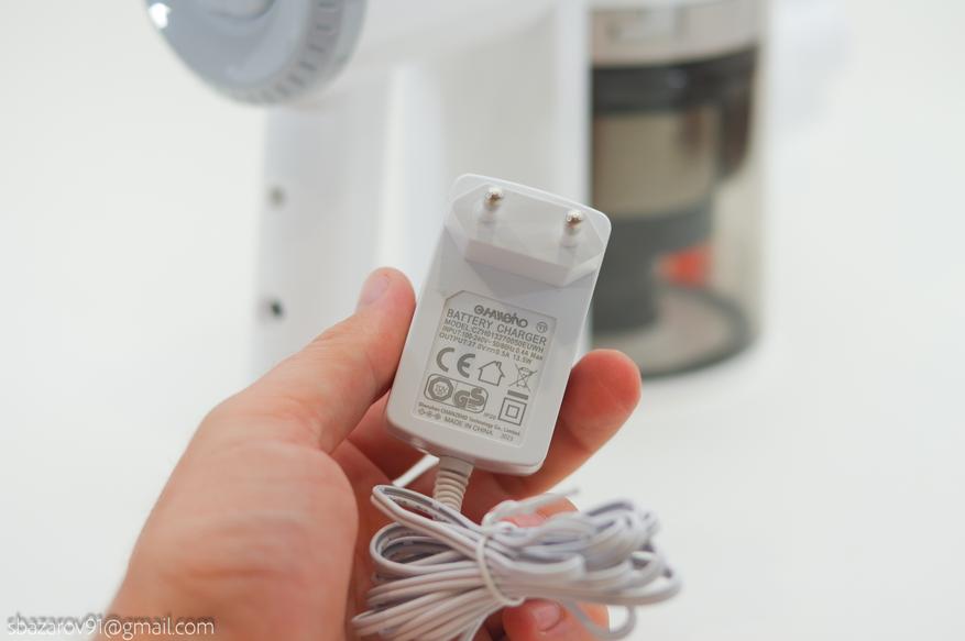 Для удобного хранения вертикального пылесоса предусмотрено стеновое крепление, в которое монтируется рукоятка. При таком расположении необходимо учитывать наличие розетки для подключения сетевого адаптера. Сам адаптер оснащен сетевым проводом длиной в 1.56 метра и выходными параметрами 27V1.5A. Общее время заряда — 4 часа 44 минуты.