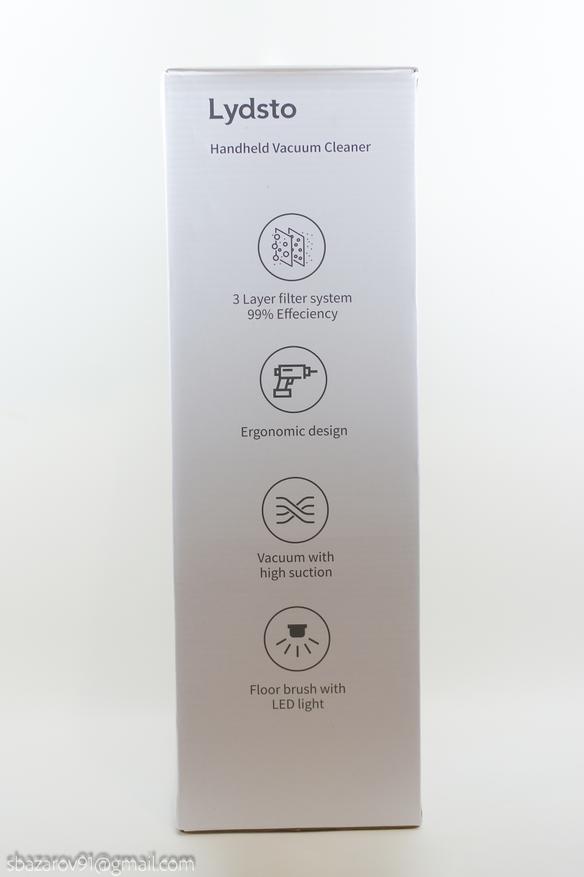 Lydsto YM-V9-03 поставляется в довольно компактной (45*28*15см) заводской упаковке белого цвета. Через мои руки прошло огромное множество вертикальных пылесосов, но чтобы они продавались в такой маленькой коробке впервые. Упаковка максимально лаконичная, так как кроме внешнего вида устройства и его названия на ней ничего нет.